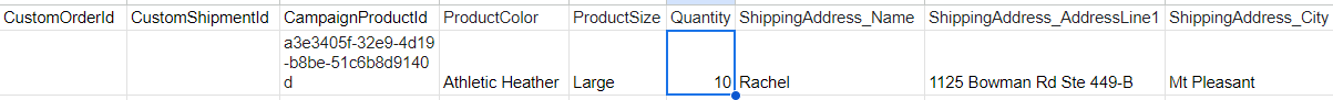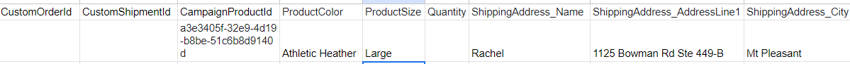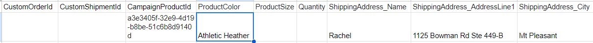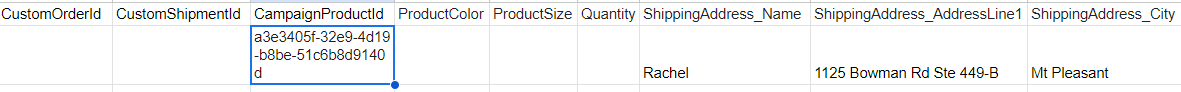 | CustomOrderId | CustomShipmentId | CampaignProductId | ProductColor | ProductSize | Quantity | ShippingAddress_Name | ShippingAddress_AddressLine1 | ShippingAddress_City | ShippingAddress_State | ShippingAddress_PostalCode | ShippingAddress_Country | CustomerEmailAddress | OrderConfirmationEmailAddress | ShipmentConfirmationEmailAddress | Priority | Quality |