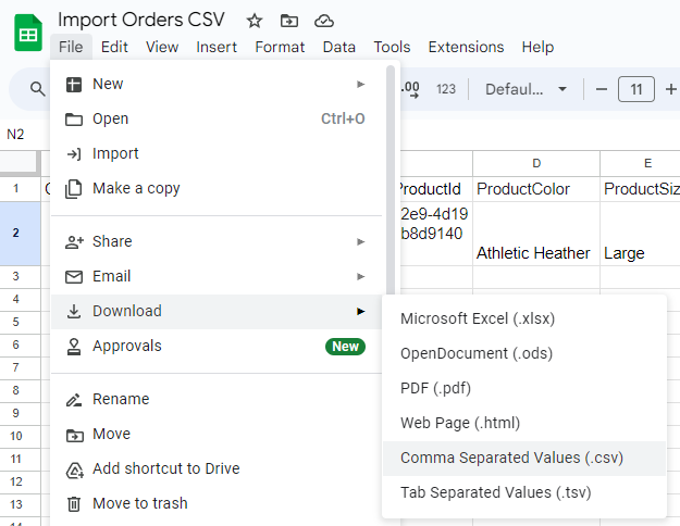 The last step is to export your file as a CSV or Comma Separated Values file. You can do this in most spreadsheet apps by going to File and selecting Export or Download. Select CSV as the file type and save the file.