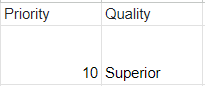 To complete the spreadsheet, add your Priority and Quality. Priority will be 10 and Quality will be Superior.