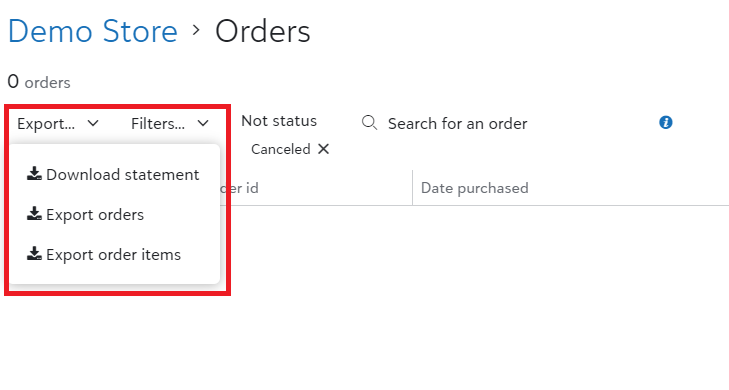 To export the order data, click the Export drop-down menu at the top of the screen and choose Export orders from the options.
