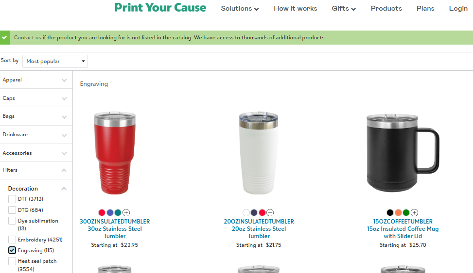 Our catalog is constantly expending. If you require an item that is carried by our suppliers, but is not reflected within our catalog, reach out to our team at info@printyourcause.com with the requested product.