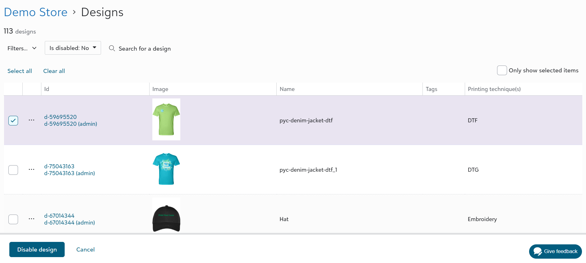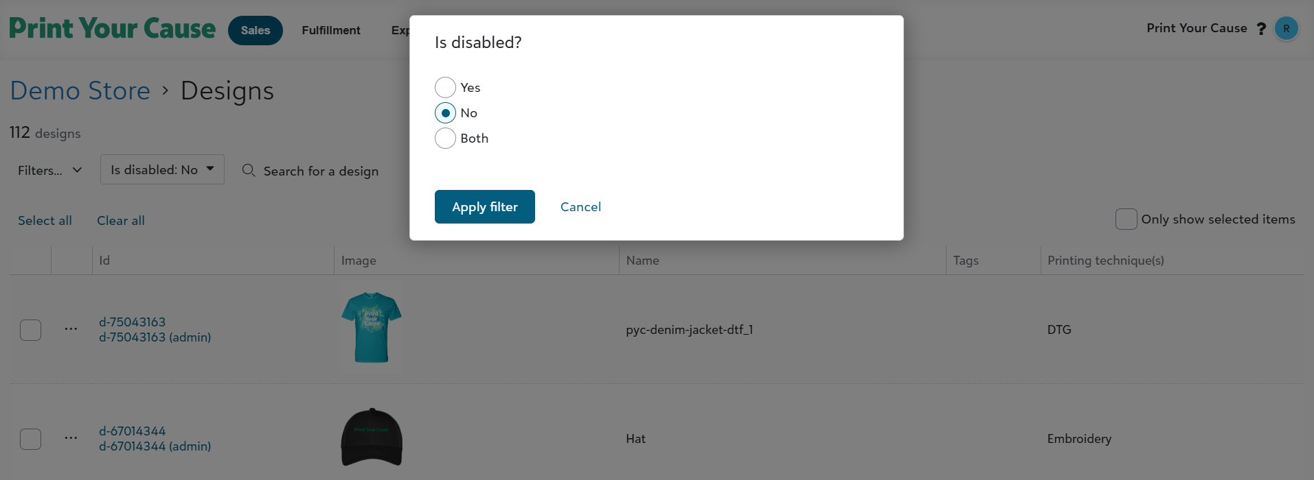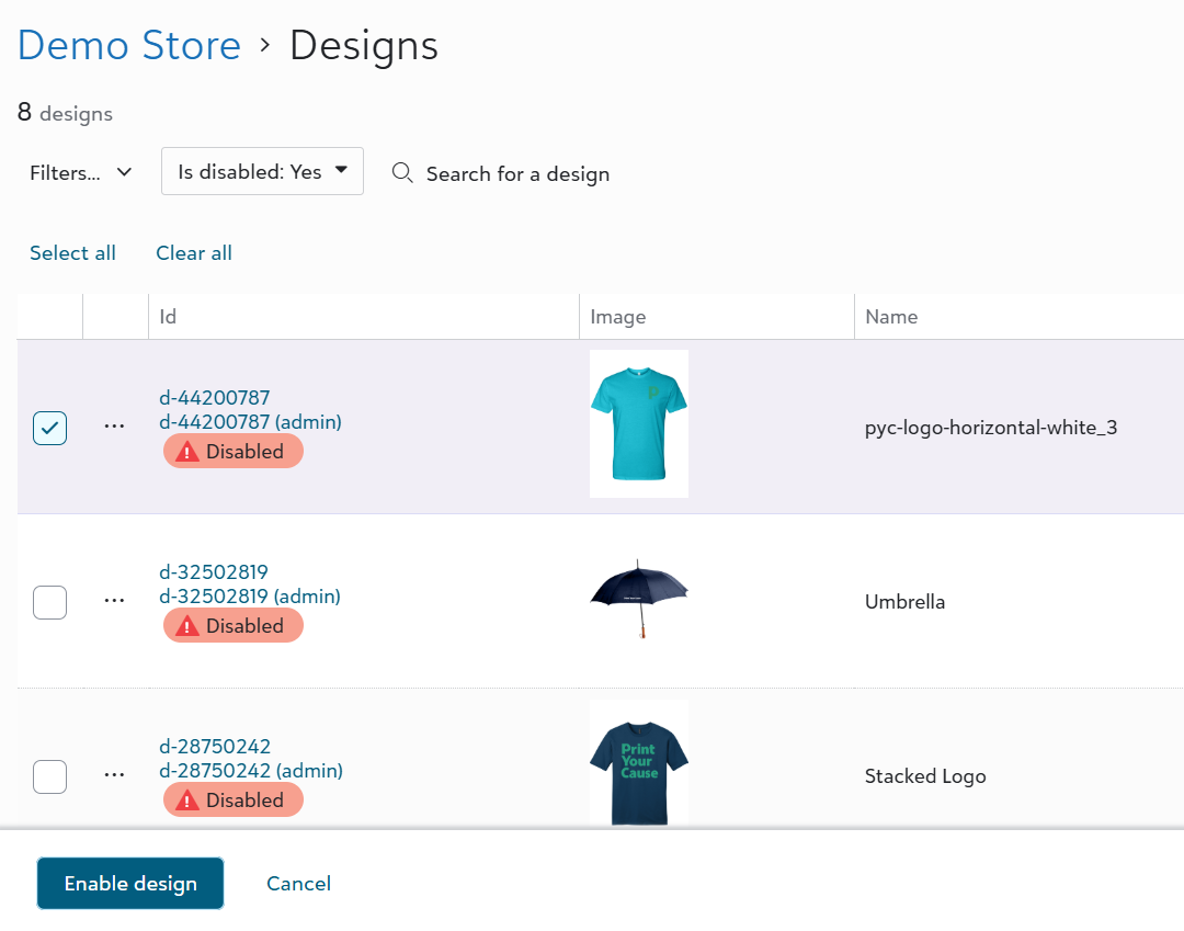 - Use the filter options to switch between enabled designs, disabled designs, or all designs. Choose Yes to view disabled designs.