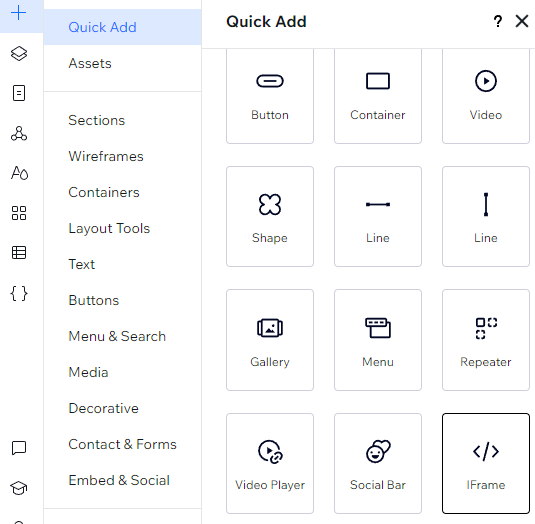 Under the Quick Add category, scroll to the bottom of the options and select IFrame.