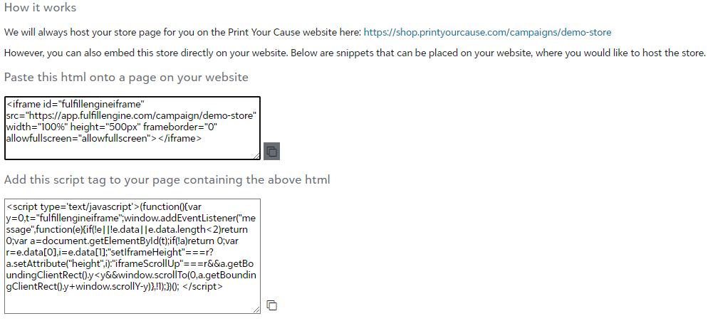 Find the Embed Store option on your Print Your Cause store page in the management portal.
