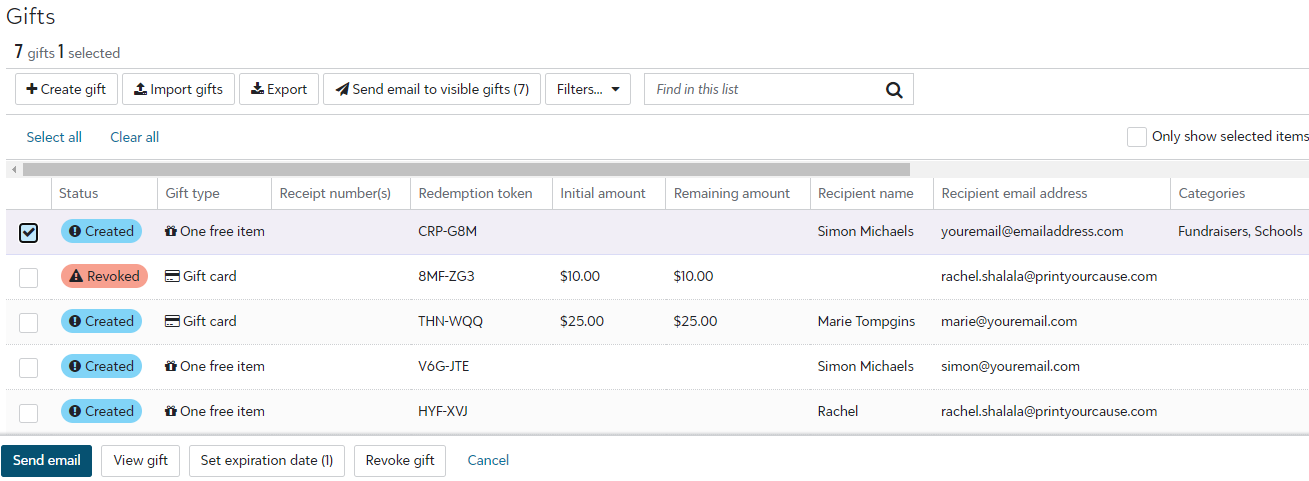Once the gift is created, you will need to send the gift code to your recipient. Select the gift(s) that you would like to send and click on the "Send email" button near the bottom left corner of the page.