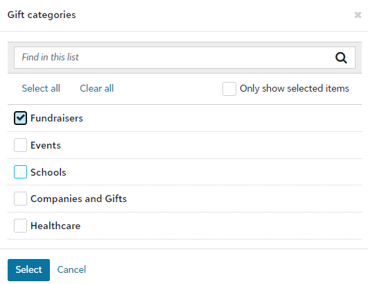 Select one or more categories that you would like the gift code to be used in. Click on the "Select" button.