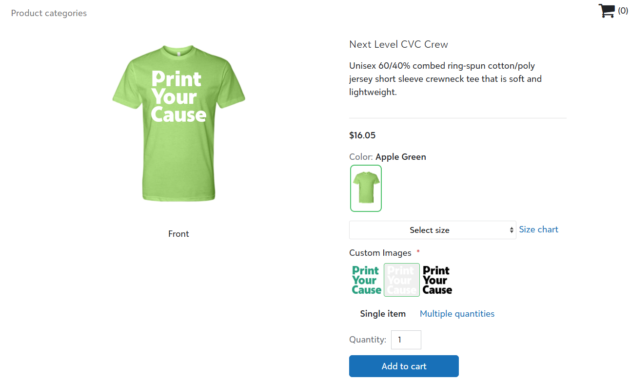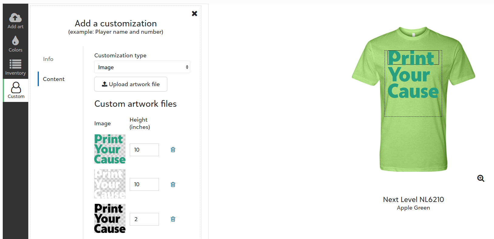 This feature allows you to offer customers the ability to choose which artwork they would like printed on their shirt.