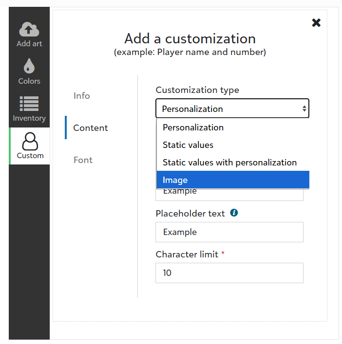 Click Content to add your custom images. From the dropdown menu, select Image.