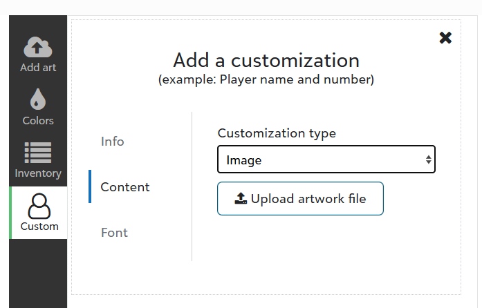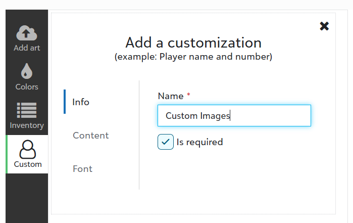Give your customization a name. If there is no other artwork on your product, you must select the "is required" box.